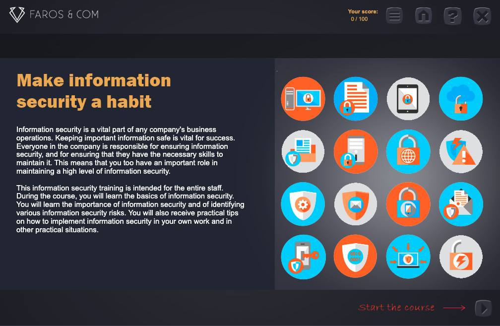 This is a SCORM sample course. This course covers the basics Information security